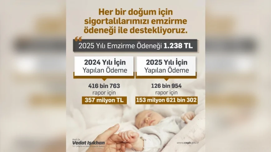 2024 yılı boyunca toplam 416 bin 763 doğum raporu için emzirme ödeneği kapsamında 357 milyon TL ödeme yapıldığı bildirildi. Söz konusu destek, doğum yapan sigortalı annelere tek seferlik olarak veriliyor.