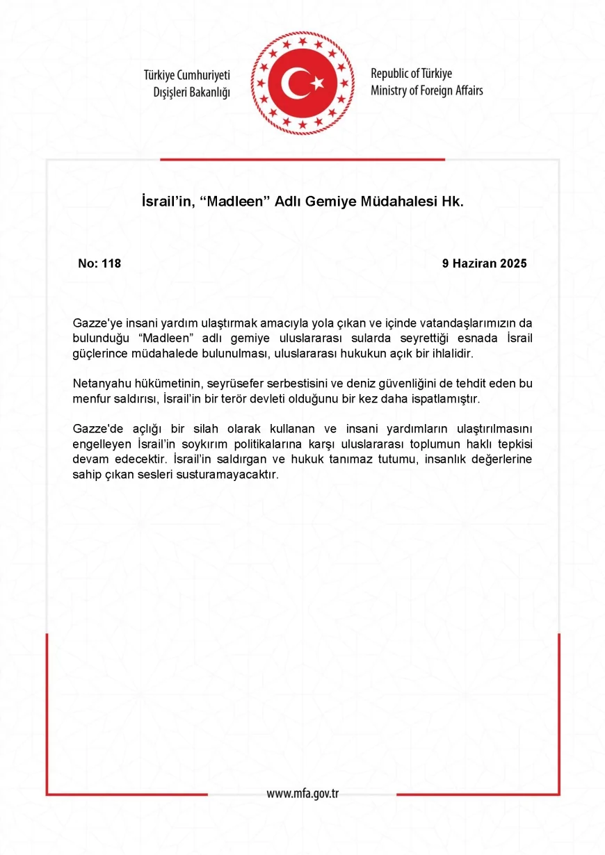 Türkiye Cumhuriyeti Dışişleri Bakanlığı, 9 Haziran 2025 tarihli yazılı açıklamasında, Gazze’ye insani yardım taşıyan “Madleen” adlı geminin uluslararası sularda seyrettiği sırada İsrail güçlerinin müdahalesine maruz kaldığını bildirdi. Gemide Türk vatandaşlarının da bulunduğu belirtildi.