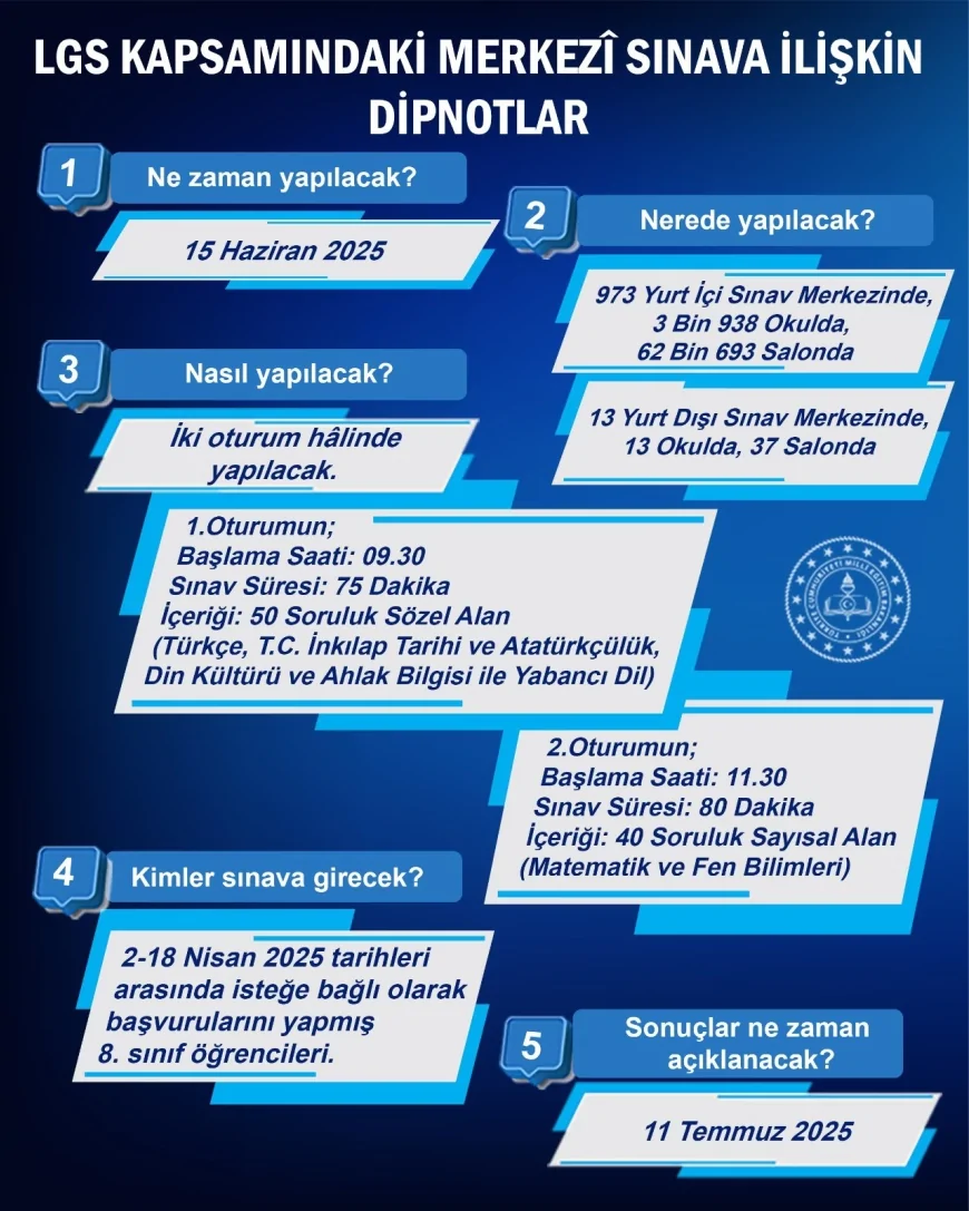 Milli Eğitim Bakanlığı (MEB), 9 Haziran Pazar günü gerçekleştirilecek olan Liselere Geçiş Sistemi (LGS) kapsamındaki merkezî sınavla ilgili öğrenci ve velilere yönelik bilgilendirme yaptı. Bakanlık tarafından yapılan açıklamada, sınavın detaylarına dikkat çekilerek öğrencilerin kurallara uyması gerektiği vurgulandı.