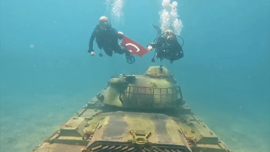 Geçtiğimiz hafta su altı turizmini geliştirmek amacıyla Gökçetepe sahilinin yaklaşık 100 metre açığına ve 10 metre derinliğe batırılan muharebe tankına dalış gerçekleştirildi. Etkinlik kapsamında jandarma ekipleri ve eğitmenler su altına inerek tank üzerinde Türk bayrağı ile birlikte ‘Jandarma 186 yaşında daima milletinin yanında’ yazılı pankart açtı.